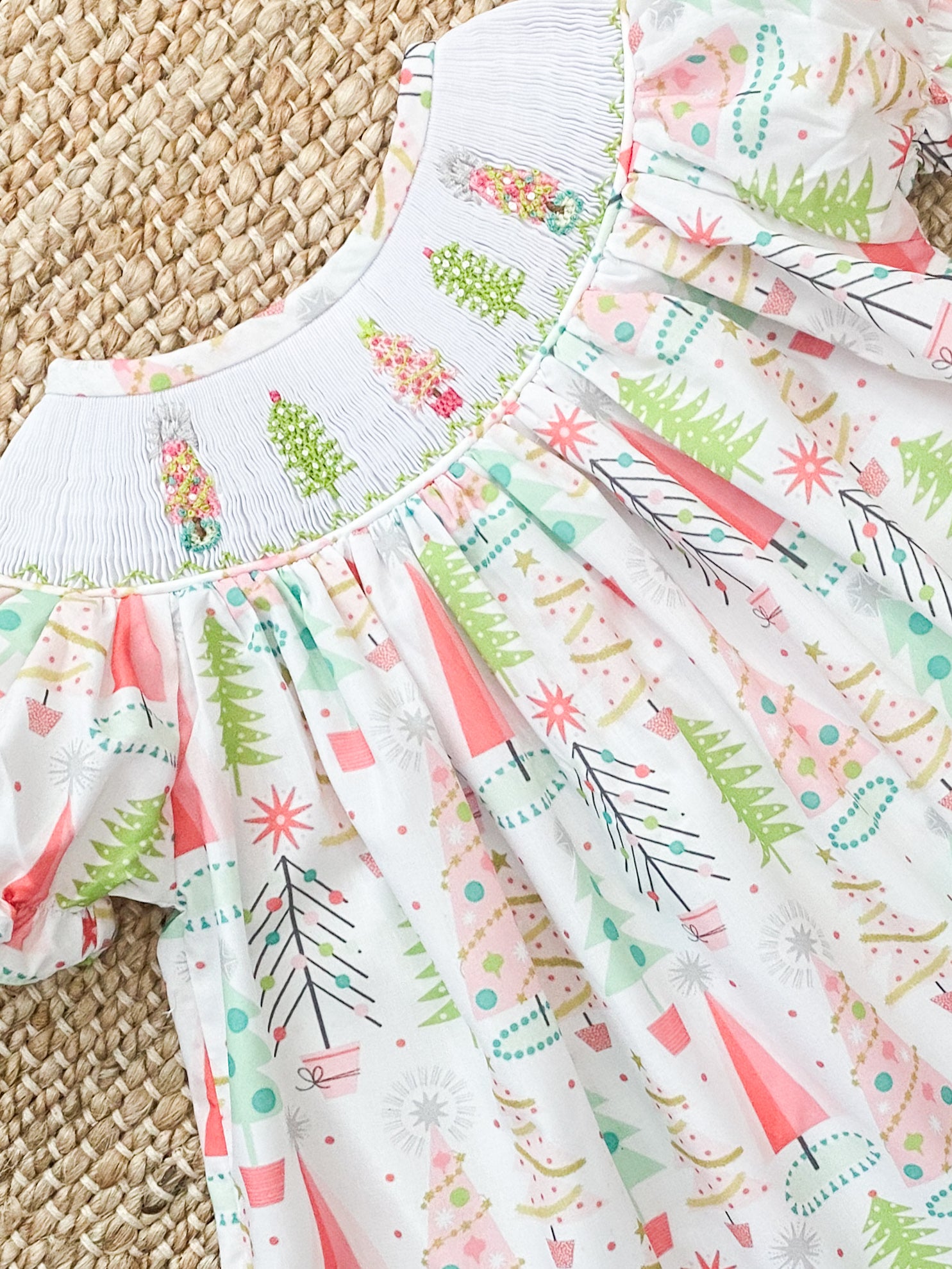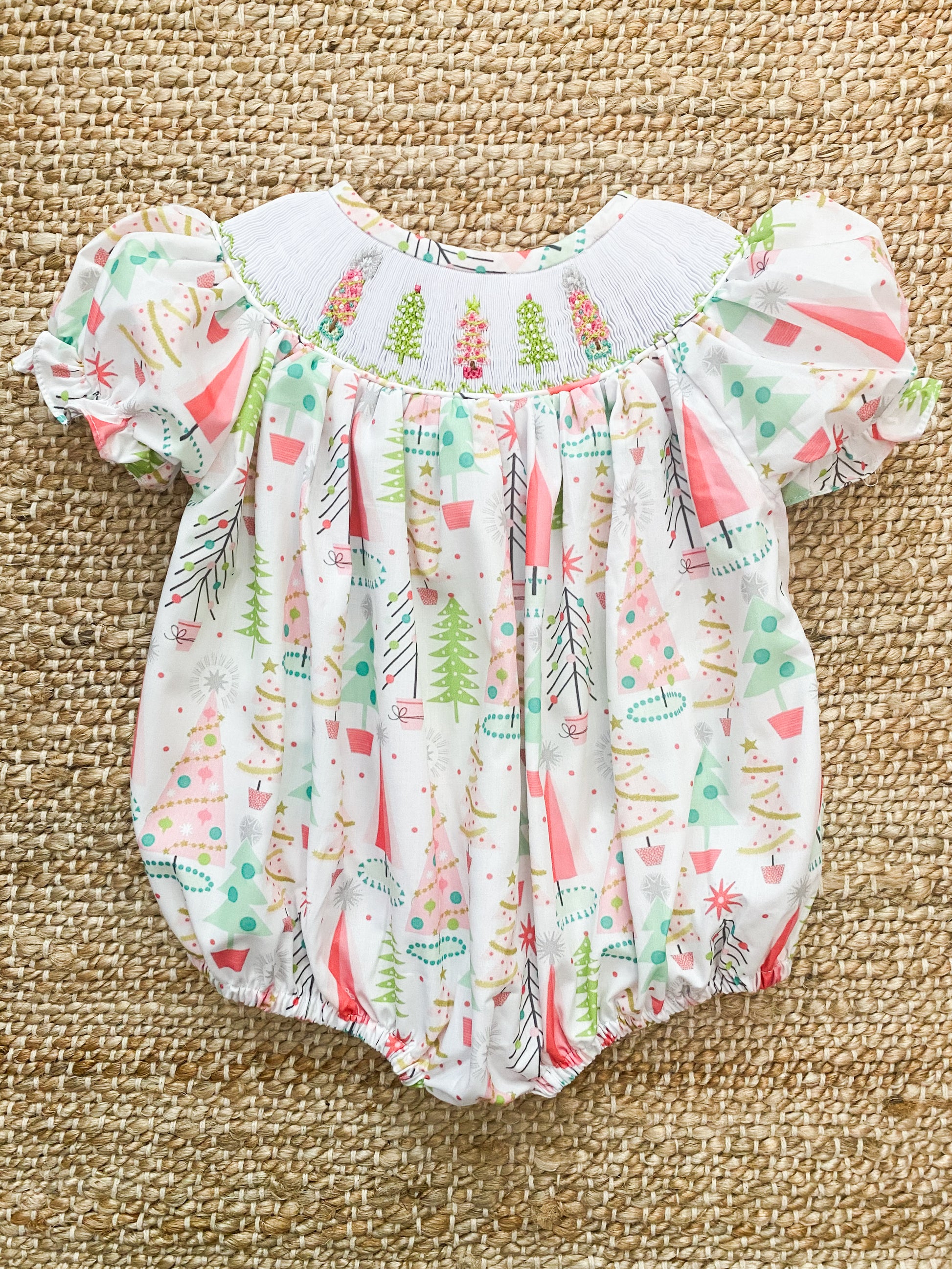 This precious Christmas tree smock is beautiful in its delicacy and boldness. The detail is paramount in this one of a kind bubble with smocked trees on the neckline and fun pattern for the bubble.
