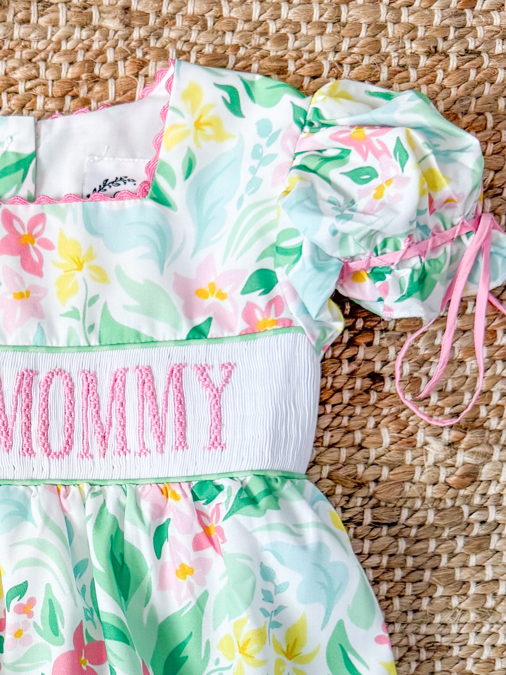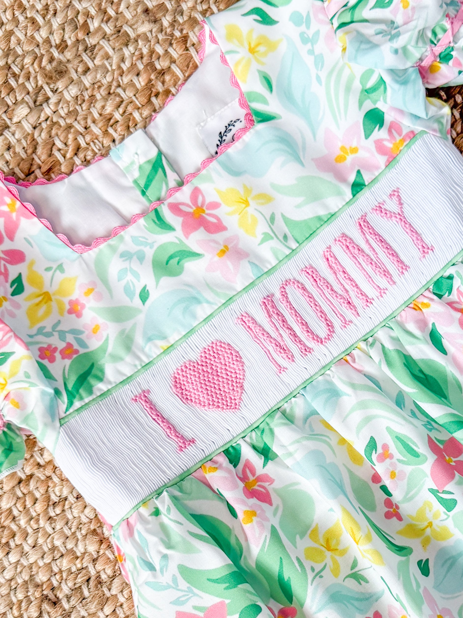 This darling I Love Mommy Bubble is a perfect outfit for your mini best friend to tag along with you on your day. It is a perfect Mother's day outfit, or an outfit for everyday wear. Regardless, your mini you will be so cute in this precious hand-smocked bubble!
