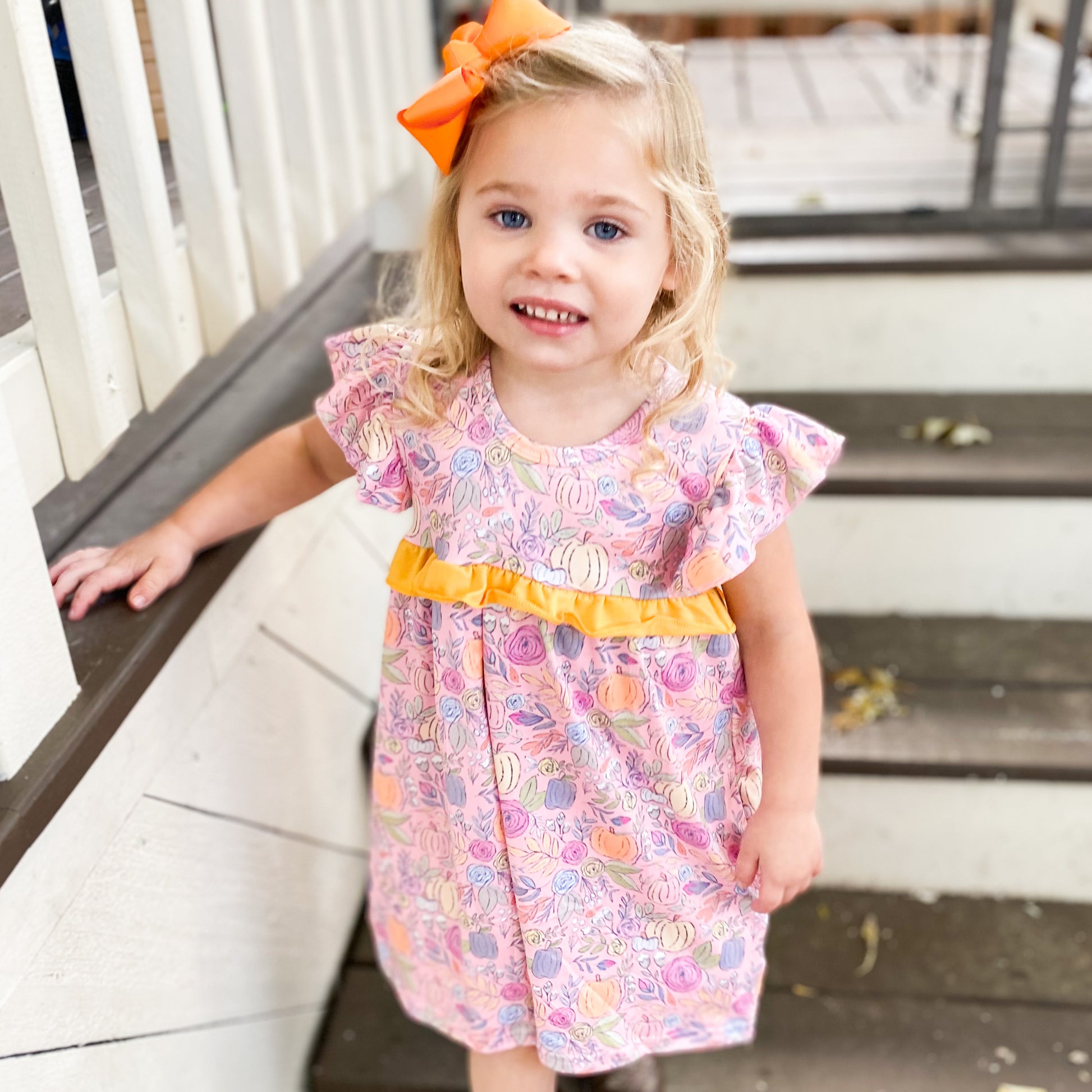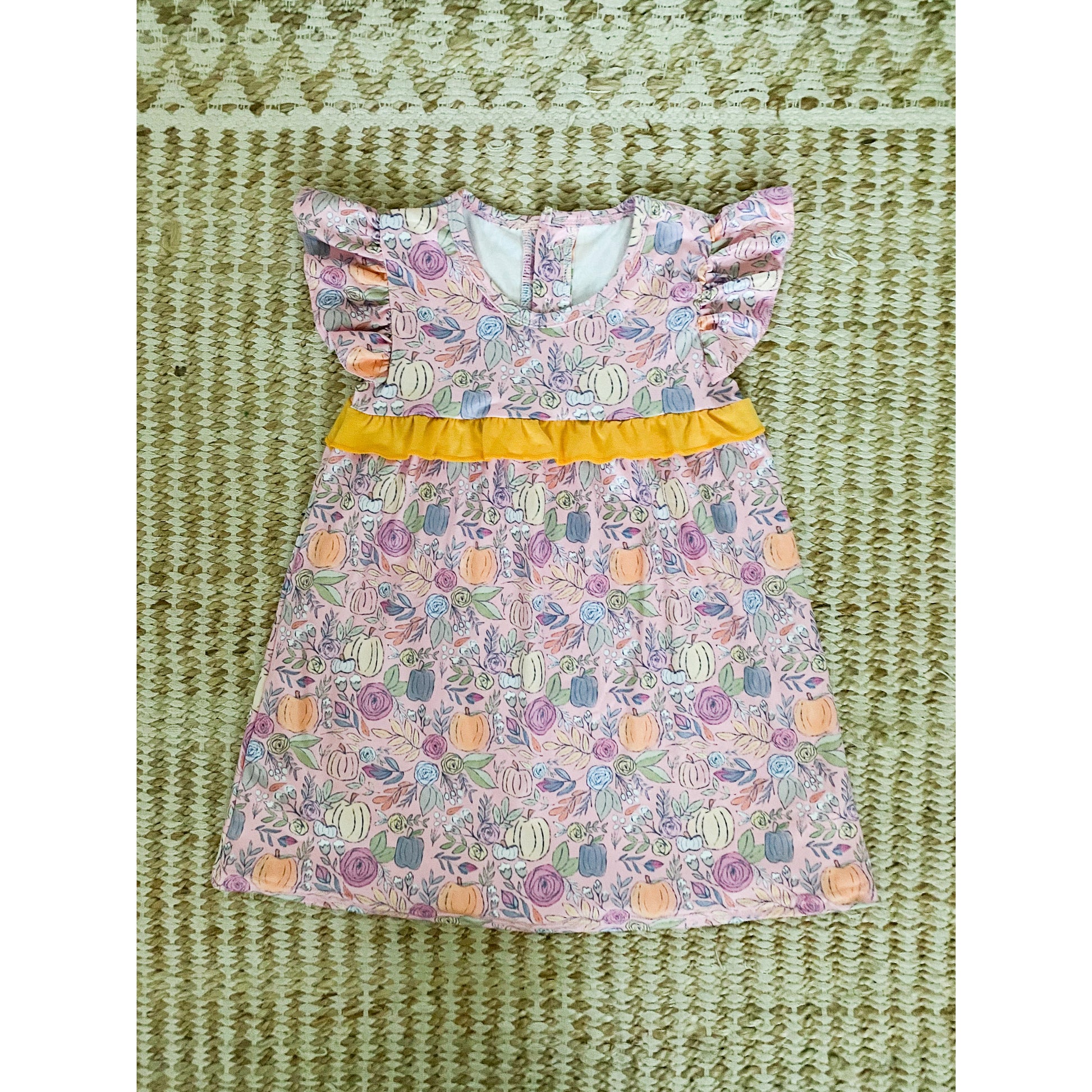 This pretty pink pumpkin dress is the perfect pairing to some boots and a jean jacket this fall. It’s subtle seasonal nod allows this dress to be worn year round!