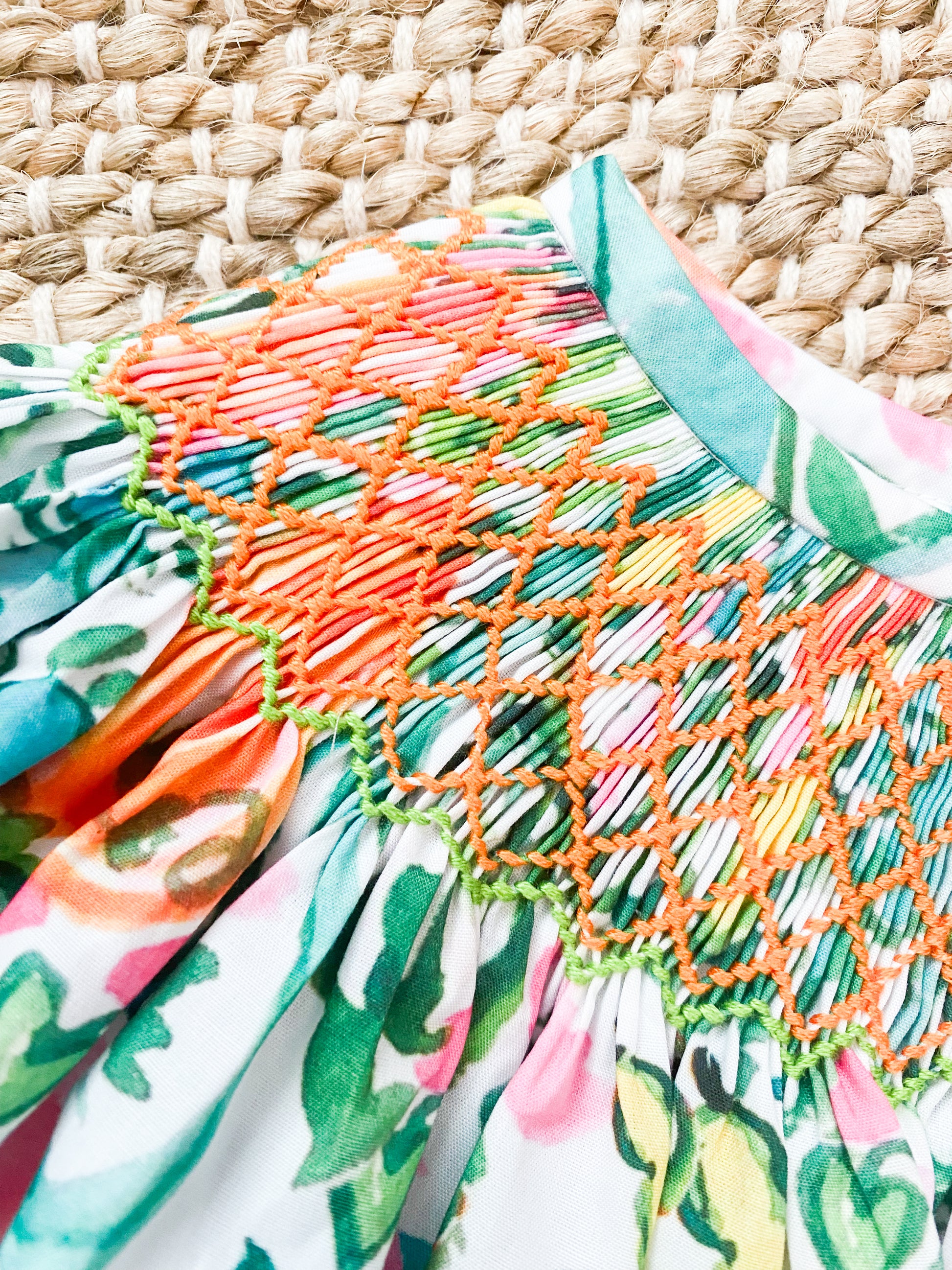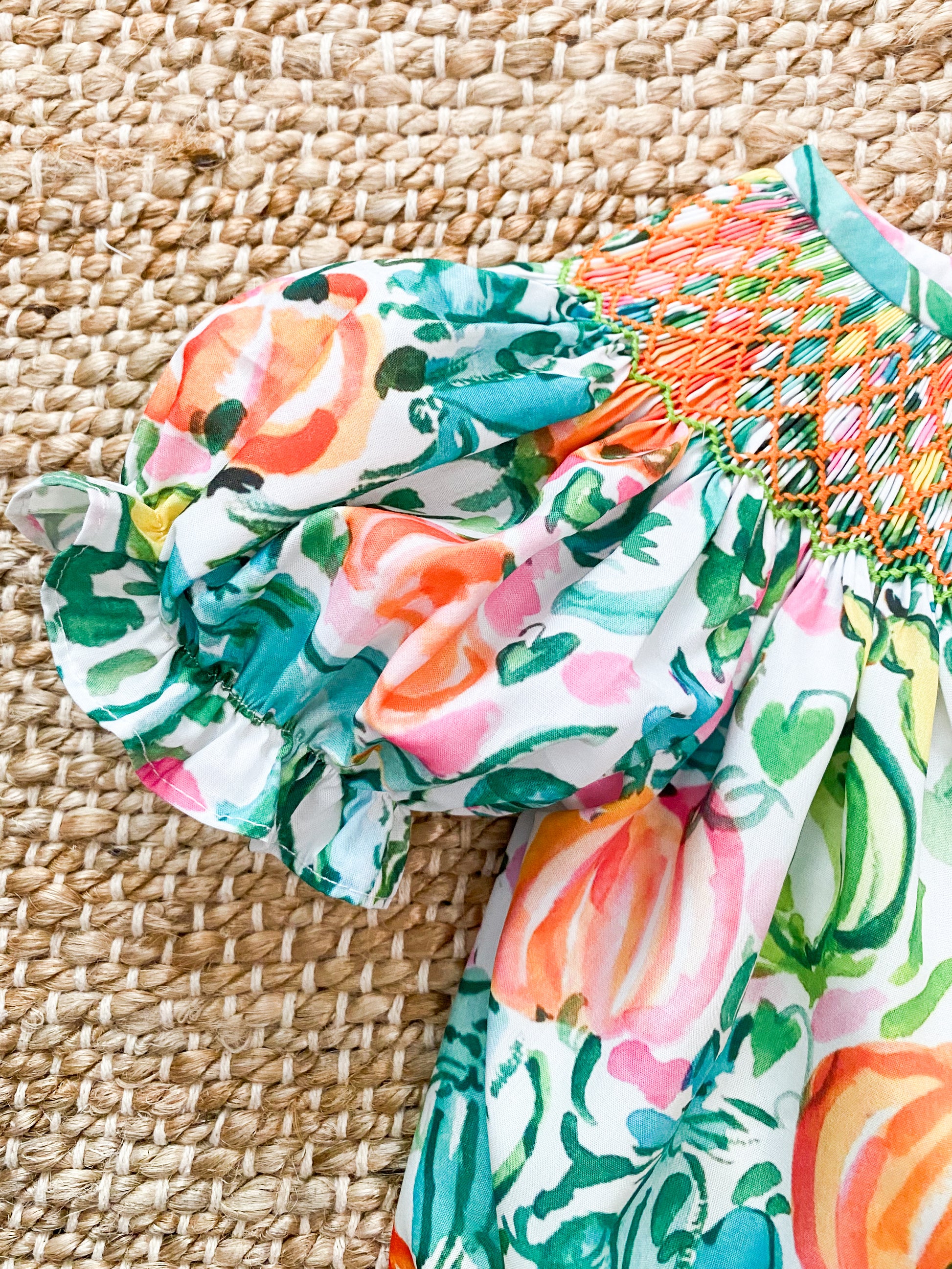 This bright pumpkin patterned geometric smock bubble will complement your little girl’s big personality and charm! Hand smocked with care and precision, this bubble is sure to make a statement!